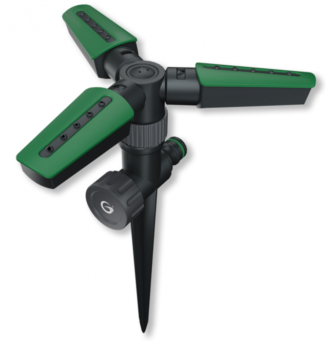 Vannsprederen festes ved å trykke den ned i gressplenen med det innebygde spydet for å stå stille selv under høyt vanningstrykk eller ruskevær.