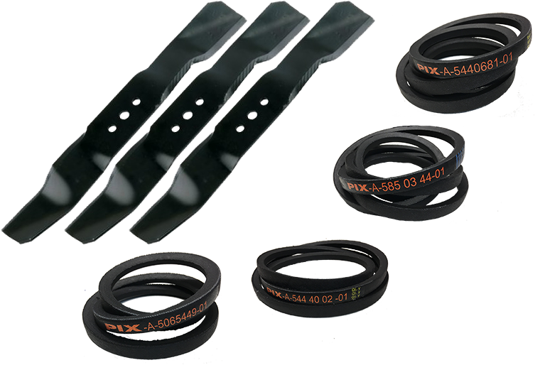 Komplett pakke med 3 stk gressklipperkniver med en lengde på 360 mm og samtlige drivreimer til Jonsered FR 2211 M, Husqvarna Rider 11 C mfl.