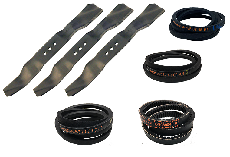 Komplett pakke med 3 stk gressklipperkniver med en lengde på 390 mm og samtlige drivreimer til Jonsered FR 2216 A (103 cm) mfl.